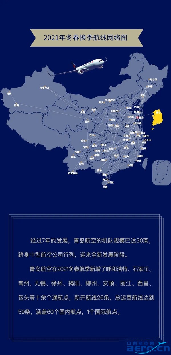 經過7年的發展,青島航空的機隊規模已達30架,躋身中型航空公司行列,迎來全新發展階段。青島航空在2021冬春航季新增了呼和浩特、石家莊、常州、無錫、徐州、揭陽、郴州、安順、麗江、西昌、包頭等十余個通航點,新開航線26條,總運營航線達到59條,涵蓋60個國內航點,1個國際航點。
