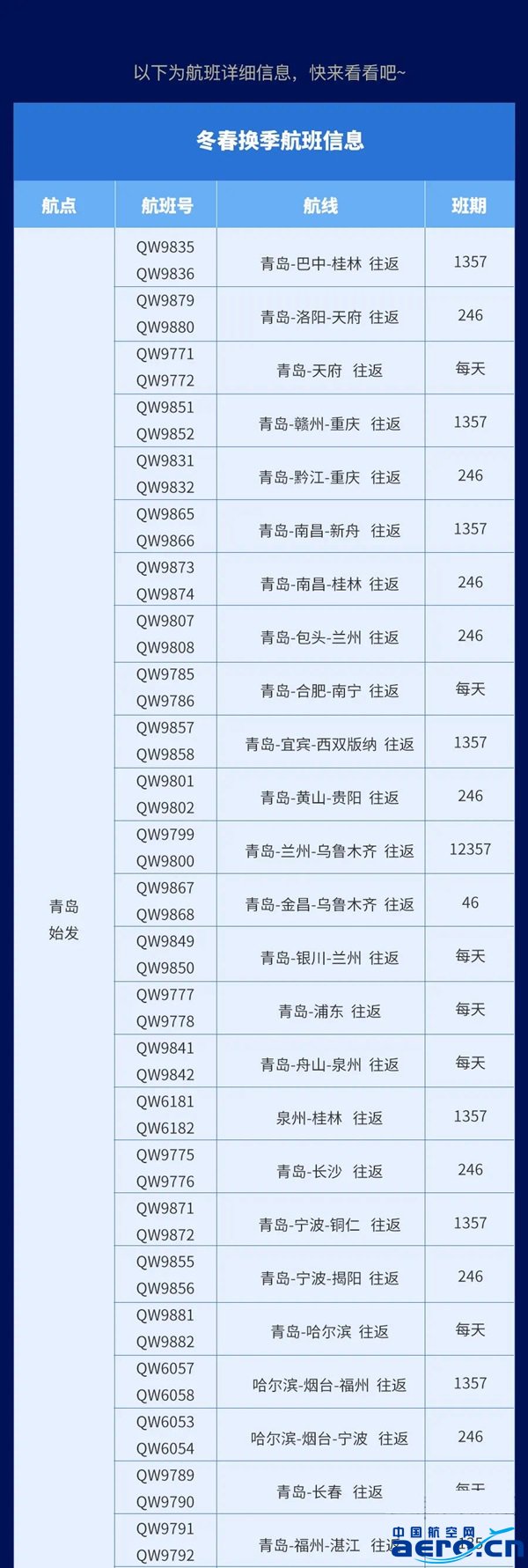 10月31日起,青島航空將開始執行冬春航季航班計劃。根據市場需求及特點,青島航空持續優化運力布局和航線網絡結構,新增大連過夜基地,加密、新增多條商務、旅游熱門航線,為廣大旅客提供更加便捷和高性價比的出行服務。