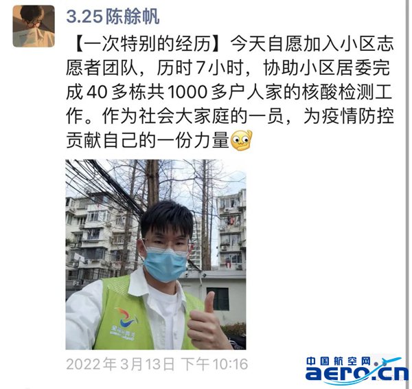 陳艅帆是機(jī)場(chǎng)地服公司一名團(tuán)員青年,他在得知所在小區(qū)將開(kāi)啟核酸檢測(cè)后,主動(dòng)報(bào)名參加抗疫志愿服務(wù),協(xié)助小區(qū)檢測(cè)點(diǎn)建設(shè)、維持核酸采樣現(xiàn)場(chǎng)秩序。在隨后的社區(qū)封閉管控期間,他每天奔波超過(guò)12小時(shí),協(xié)助社區(qū)居民出示檢測(cè)碼、組織體溫檢測(cè)、給獨(dú)居老人送飯、為被封閉樓棟的住戶送快遞。