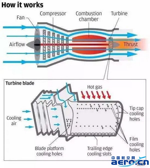 同時采用先進的冷卻空氣氣膜冷卻技術降低葉片表面的溫度,以保護渦輪葉片,最大化提高渦輪葉片的工作質量,延長在翼工作時間。