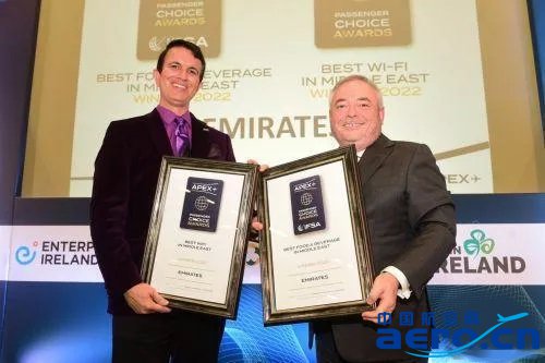 憑借全球乘客的高度認可,阿聯酋航空近日在愛爾蘭都柏林舉行的2022年APEX區域乘客之選(APEX Regional Passenger Choice Awards®)頒獎典禮上,一舉榮獲中東地區“最佳機上Wi-Fi”和“最佳餐飲”兩項大獎。