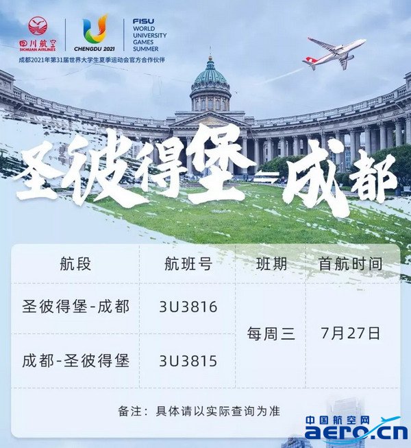 圣彼得堡=成都航線也即將復航,7月27日,每周三一班。