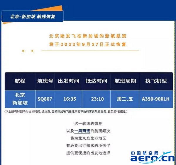 據" 新加坡航空 " 微信公眾號發布,北京始發飛往新加坡的新航航班將于 2022 年 9 月 27 日正式恢復。每個星期執飛兩班。新加坡飛往北京暫不執行客運航班服務,直至另行通知。 北京至新加坡航班將采用空客 A350-900 遠程客機運營。