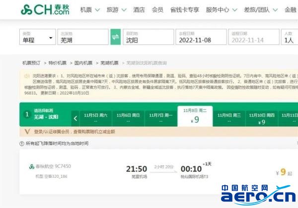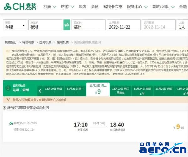 11月1日,春秋航空相關(guān)負(fù)責(zé)人告訴記者,9元機(jī)票屬實(shí)。不僅僅是蕪湖-沈陽航線有9元機(jī)票,蕪湖-福州、蕪湖-石家莊等航線的特價(jià)機(jī)票也僅需9元,蕪湖飛廈門的特價(jià)機(jī)票也僅需59元。