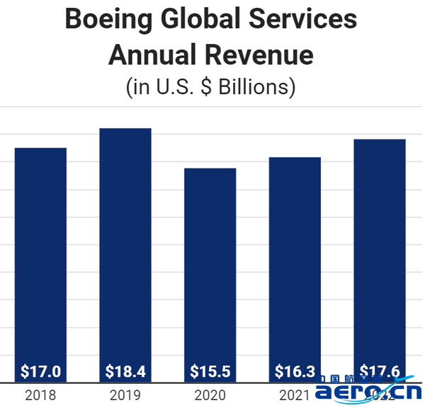BGS 2022年全年收入為176億美元(見圖表)。雖然仍低于2019年184億美元的峰值,但該業務顯然處于增長模式。該公司表示,收入分配回到了60%的民航和40%的軍事航空——另一個疫情前的基準——民航服務數量已經“恢復到疫情前的水平”。