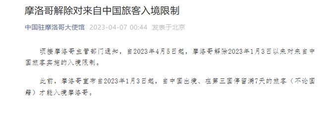 頃接摩洛哥主管部門通知,自2023年4月5日起,摩洛哥解除2023年1月3日以來對來自中國旅客實施的入境限制。 此前,摩洛哥宣布自2023年1月3日起,自中國出境、在第三國停留滿7天的旅客(不論國籍)才能入境摩洛哥。