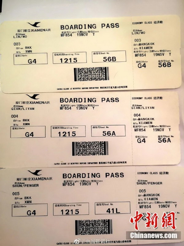 媽祖(原名林默)、千里眼和順風耳從曼谷返回廈門的登機牌。圖片來源:中新網