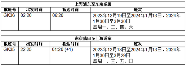 復航首趟抵達上海的航班為GK35,于12月18日(星期一)22:36從成田國際機場起飛,于12月19日凌晨01:06抵達上海;GK36于今日凌晨12月19日02:24從上海浦東起飛,于當天06:12抵達日本成田。