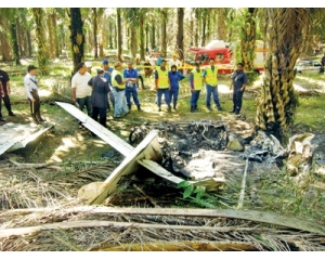 圖:2010年9月7日早9時許,馬來西亞一架從士乃機場起飛的小型飛機在蒲來山油棕園上空盤旋幾圈后突然失控墜毀。機上華裔女飛行員當場被燒焦,男傷者遭嚴重燒傷,被送往醫院急救。圖為遺留在現場的飛機殘...