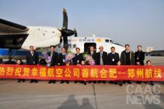中國民航新聞信息網通訊員 蔣曉東 報道:12月16日下午2點30分左右,一架新舟60小型客機平穩降落在合肥駱崗國際機場,標志著幸福航空公司成功首航鄭州合肥航線。在機坪,禮儀人員向隨機前來的幸福航空公司總經理楊尤昌、常務副總經理周慶升以及機組人員獻上鮮...