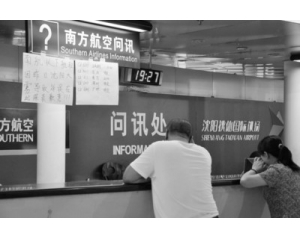 圖:8月12日晚7時27分,沈陽桃仙國際機場內(nèi)南方航空公司的問訊處貼著通知:因大霧原因部分航班延誤,有的起飛時間尚不明確。 攝影:于島 昨晚(12日)8時15分,在延誤了6個多小時后,乘坐中國南方航空股份有限公司(China Southern Airlines Company Limited...