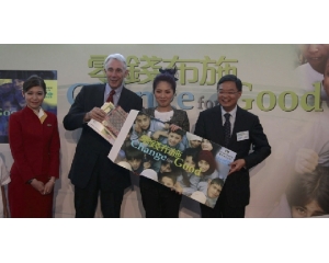 圖1:左二起:國泰航空行政總裁湯彥麟與聯(lián)合國兒童基金會(東亞及太平洋地區(qū))大使楊千嬅及聯(lián)合國兒童基金香港委員會主席龍漢標今天一起出席記者會。湯彥麟把紙幣投入捐款信封內(nèi)象征零錢布施踏入20周年。 國泰航空/聯(lián)合國兒童基金會零錢布施機上籌款活動于2010...